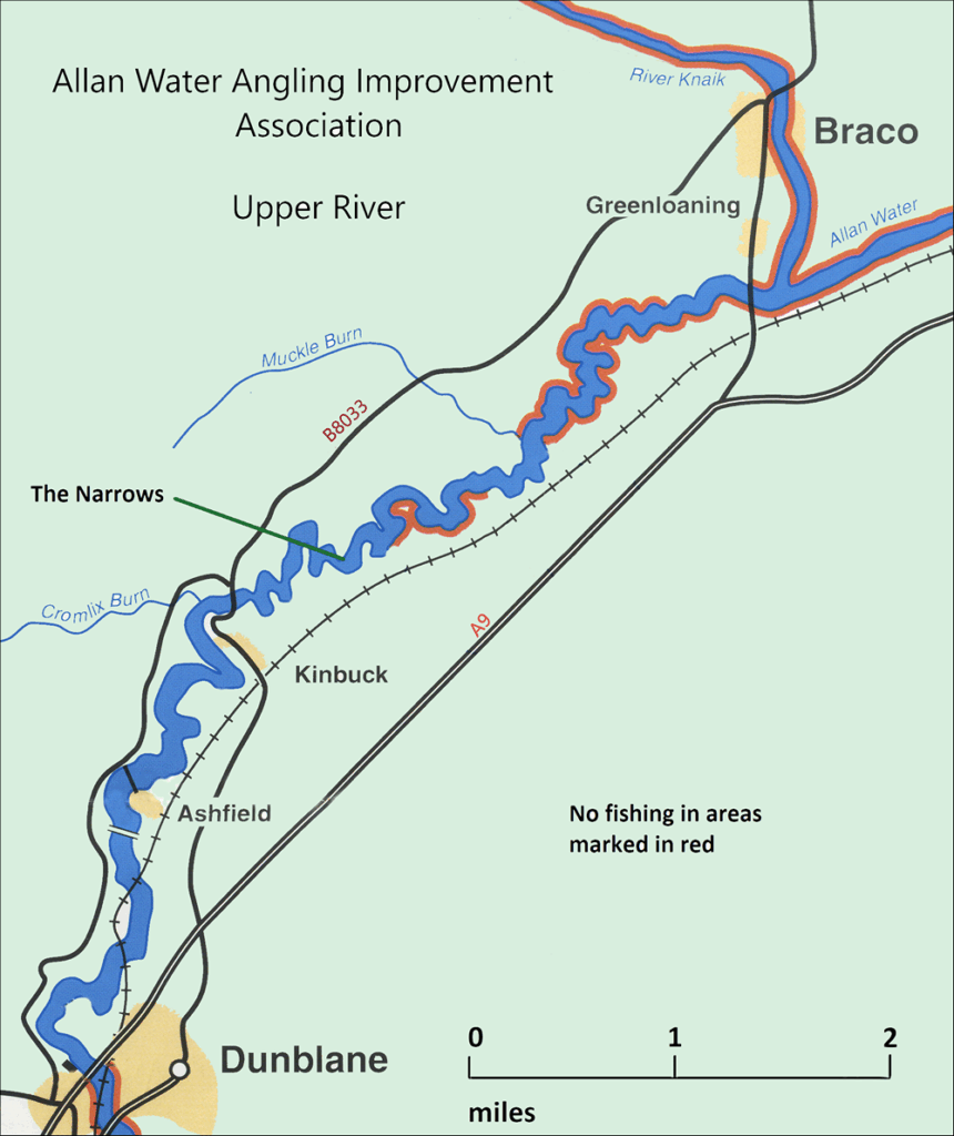 With its source at the head of Strathallan, Allan Water is joined by the River Knaik near Greenloaning, where it becomes a worthwhile game fishing river. The upper section of the association water features several gravelly runs and pools, before meandering through the flat expanse of the Strathallan flood plain, with its many deep, slow holding pools lying between high, open clay and sandy banks, with little in the way of bankside vegetation.