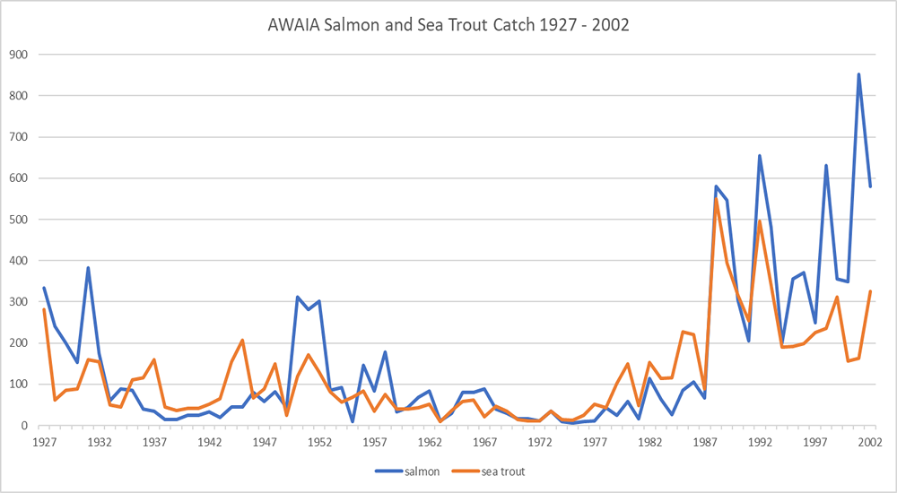 Throughout much of the twentieth century, the potential of Allan Water as a game fishing river had been held back by a continuous onslaught of adversity and misfortune. For a long time, industrial and domestic pollution left the lower river virtually uninhabitable for trout and impassable for migratory fish; ill-conceived drainage schemes silted up the spawning beds; while many running salmon and sea trout were intercepted in the lower river by netsmen or poachers. It was only in the late eighties that many of the problems were addressed, resulting in a dramatic improvement in the yearly runs, and rod catches, of migratory salmon and sea trout, as illustrated in the graph below.