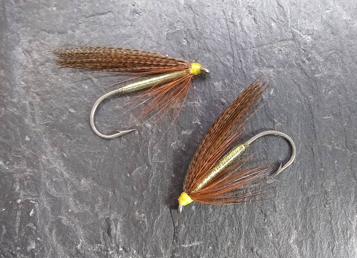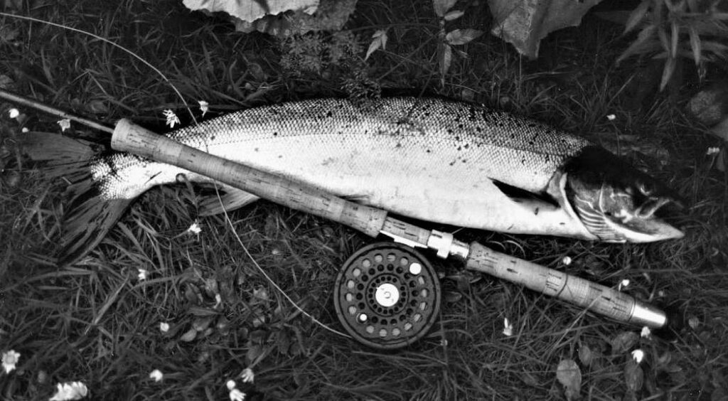 It was now very dark as I dropped down off the high bank quietly into the river. On my first cast I hooked a very lively sea trout of 2½lb which fought hard, coming out of the water two or three times, giving great sport on the ten-foot rod I had recently built on a Bruce and Walker “Light Line” blank, matched to a DT5F Aircel fly line and 5lb nylon cast. The successful fly was dressed on a size 10 longshank Partridge Grey Shadow hook, with a grey squirrel wing, a body of fine nylon line wound in touching turns over pearl lurex over yellow thread, and a ginger hackle. I later dressed this fly with either a squirrel tail or, more usually, a mallard wing and called it the Ginger Pearl, a fly that has taken numerous sea trout over the years.