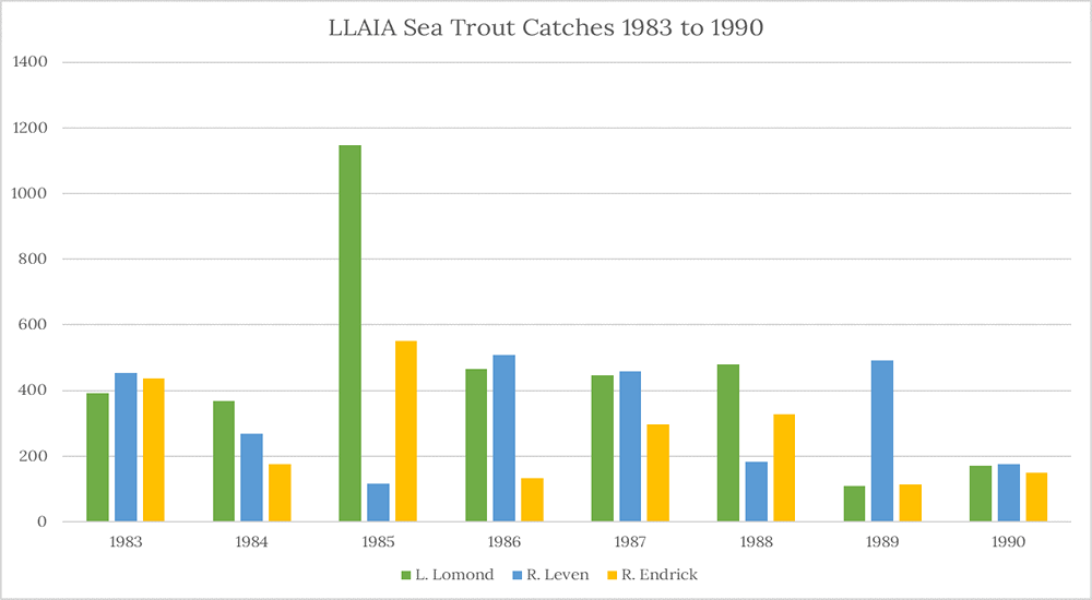 Despite excellent catches on Loch Lomond in 1985, catches of sea trout on the loch and on the Rivers Leven and Endrick throughout the eighties were lower than in earlier decades, with a particularly poor year in 1990.