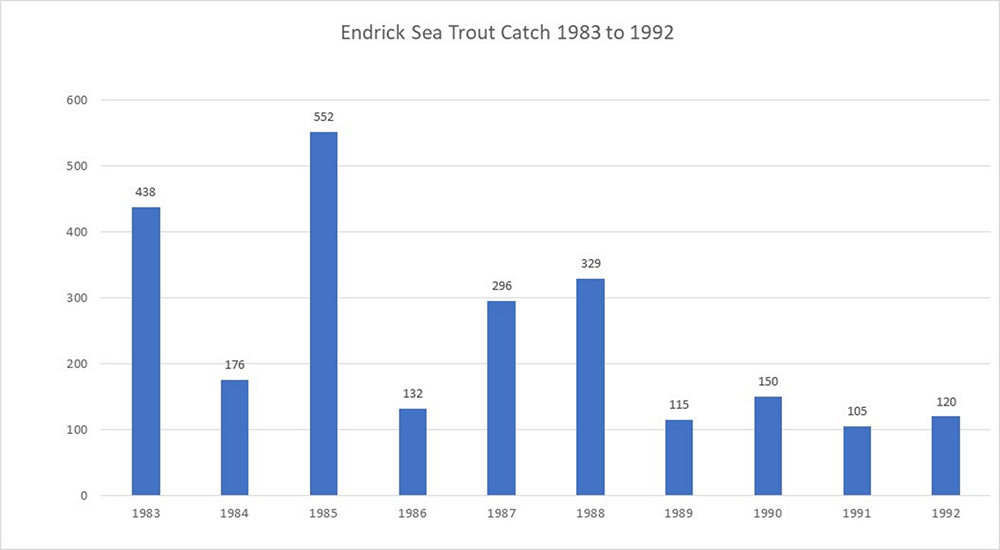 Nights like this, nights we dream of, were rare indeed. Nevertheless, one or two fish could usually be caught on any suitable night. I ended that season with a total of 29 sea trout, a poor result compared to 1985, with my own reduced catch reflected in the total recorded by the association that same year on the Endrick (see graph of Endrick sea trout catches below).