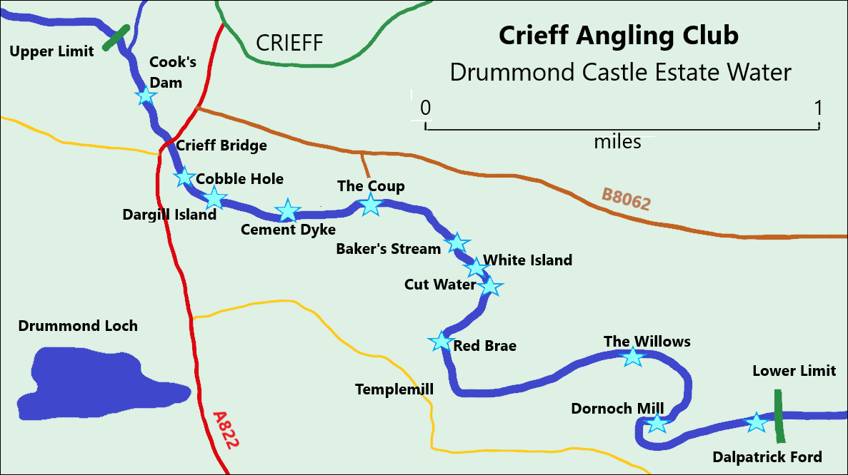 The Crieff Angling Club manages the fishing on two major beats of the River Earn: the Strowan Estate water, situated between Comrie and Crieff, and the Drummond Castle Estate water, the more extensive and productive beat, below Crieff bridge, with a shorter stretch at Braidhaugh immediately above Crieff Bridge