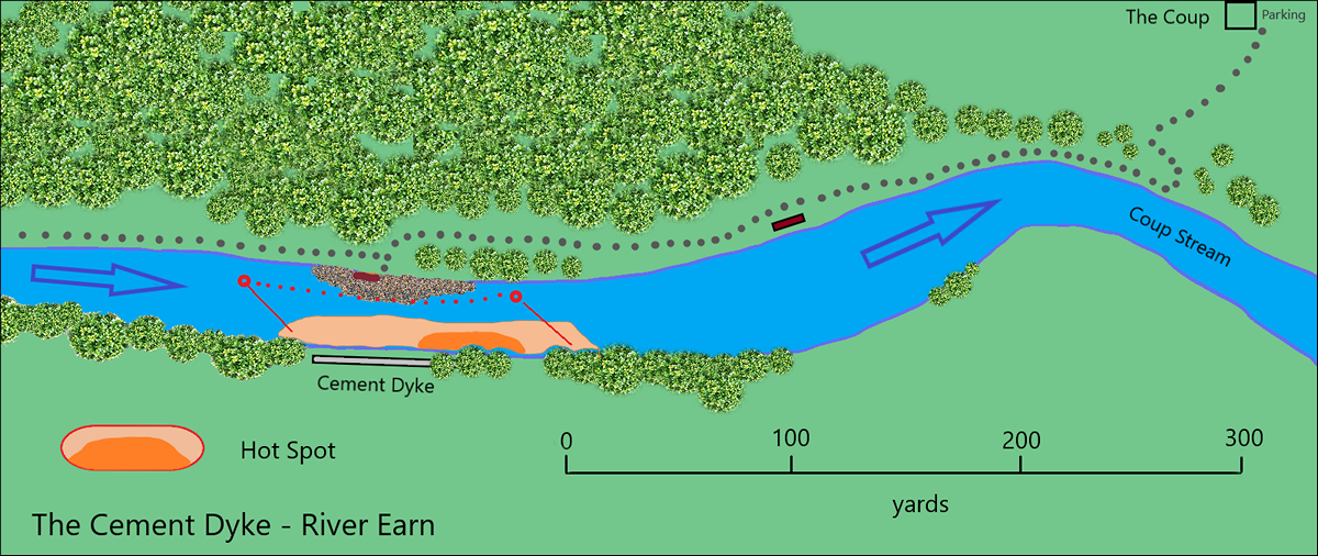 The pool, perhaps more accurately described as a glide, lies at the top end of a long pool above the Coup Stream. From a series of pools and flats upstream, also worthy of some attention at night, the river narrows slightly, with a gradually shelving bank of rounded stones and shingle, exposed in time of low water, on the left and a deeper stream, four or five feet deep, flowing steadily along the far right bank under a low cement wall, from which the pool takes its name, built to retain the riverbank. The glide flows ever more slowly as it enters a long deep section, heavily treed on the right bank for nearly 100 yards, then the trees thin. The river, now bordered by open pasture on the right bank, flows for a further hundred and fifty yards, gradually shallowing into a weedy tail before picking up pace and falling into the rapid flow of the Coup Stream below.