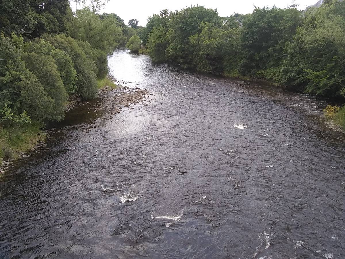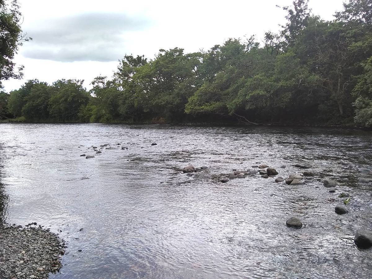 There was a threat of thundery rain to the west, with the night temperature forecast to remain above 11°C. I parked at the Coup and took the path which would lead me the half mile upstream to the Cement Dyke, now fast establishing itself as my favourite pool. I was pleased to note heavy cloud cover, with an upstream easterly wind, not strong enough to be troublesome but strong enough, if it persisted, to keep a late evening mist off the water, and help to disperse the midgies. Surprisingly, there were no other fishers to be seen, perhaps because the river level had dropped six inches since Tuesday and was now running very low, with a large area of pebble shoreline exposed on the left bank opposite the fence end. I had caught sea trout earlier last month in this height of water, though, and so was hopeful.