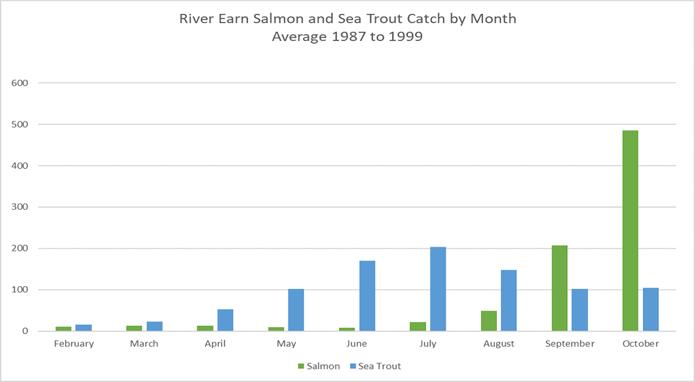 The graph above shows the pattern of monthly salmon and sea trout catches on the River Earn throughout the season. A typical year would follow this pattern, offering the prospect of worthwhile sea trout fishing from late April through to early August, by which time most sea trout would be starting to colour and past their best. It would then be time to prepare for the arrival of the main salmon run.
