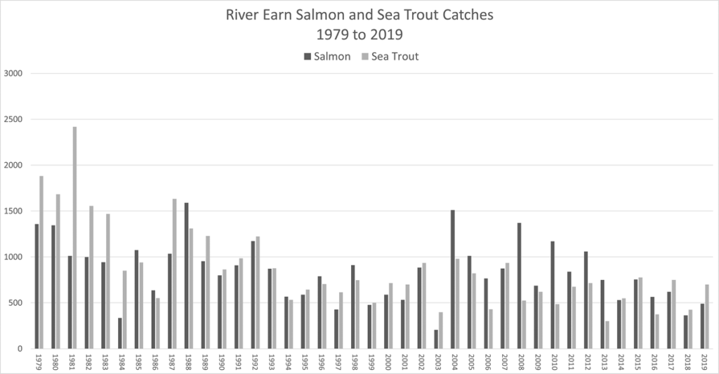 As can be seen from the graph below, sea trout catches on the River Earn, in the early eighties in particular, were very respectable indeed. Oh, to have been fishing for Earn sea trout in 1981, when a rod catch of 2418 was recorded!