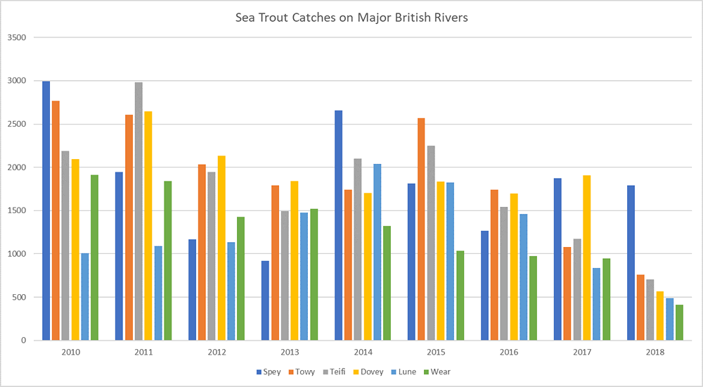 Following on from the above table, the graph below shows how the catches on six of the most famous British sea trout rivers have compared over recent years.